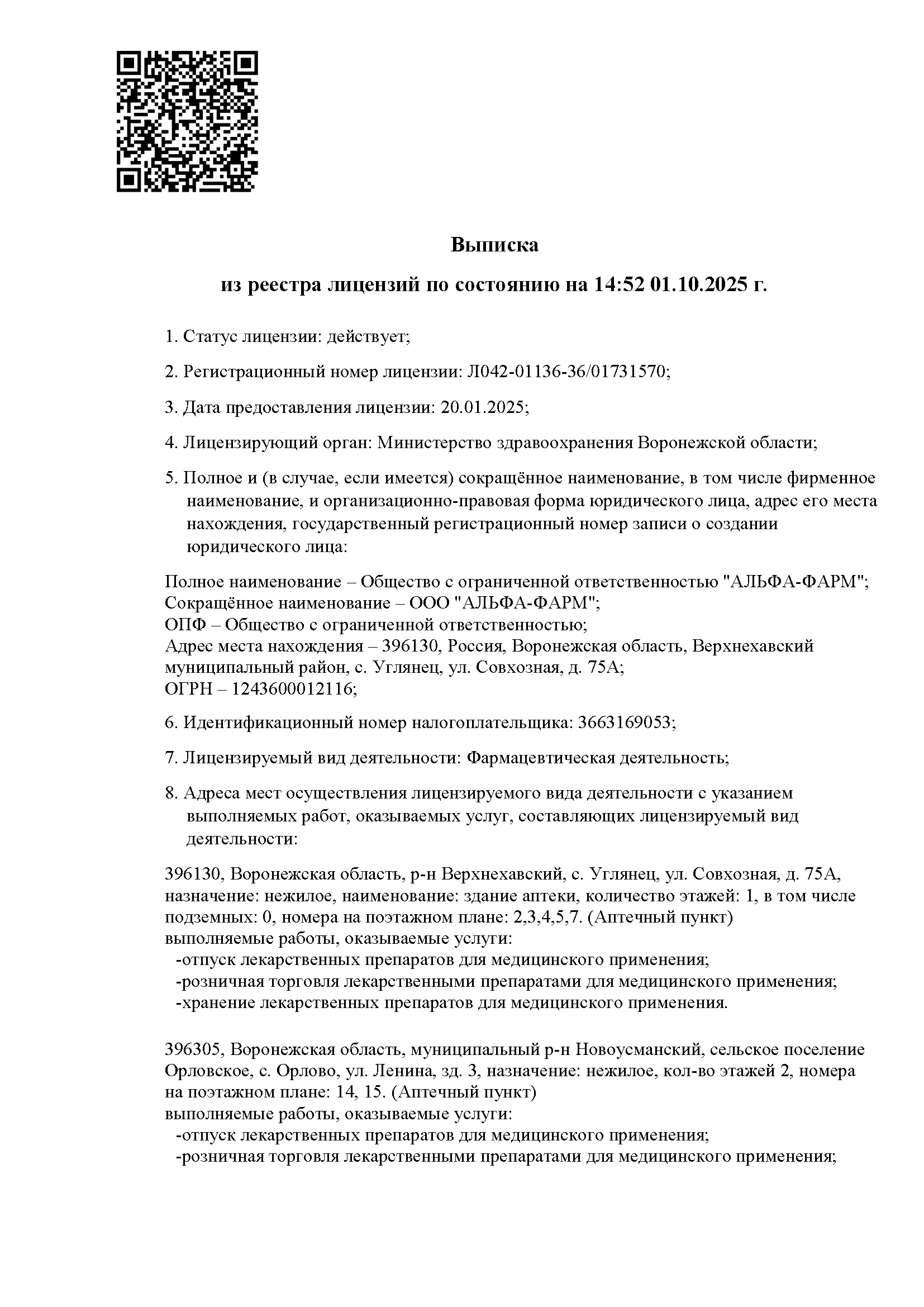 ООО «АЛЬФА-ФАРМ» осуществляет деятельность на основании действующей лицензии на фармацевтическую деятельность, выданной в установленном порядке.
